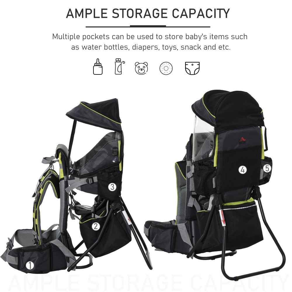COMFORTABLE & SAFE SEAT: Thick sponge padded seat and covered with soft plush offer baby incredible comfortable sitting experience. 5-point safety harness and wrapped shoulder ensure your baby's safety when in use. The detachable rain cover included shields your baby from the bad elements.LABORSAVING: Equips with wide shoulder straps with thick padding, you won't feel tired if carry baby for a long time. Adjustable wide padded waist belt can share the force to provide parents the most labor-saving and comfortable ways.HIGH-QUALITY MATERIAL: Made of high-quality Oxford cloth, water-resistant and durable for long-term use. Comes with robust aluminium frame, lightweight but yet sturdy. Support base included allow it to sit upright on a flat surface.MULTIPLE STORAGE POCKETS: Features multiple pockets to store baby's items, such as milk bottles, diapers, baby's toys, clothes, etc. The waist pocket can be used to store your phone.FOLDABLE DESIGN: Can be folded when not in use, won't take up space. Overall Dimension: 38L x 77W x 87.5H cm