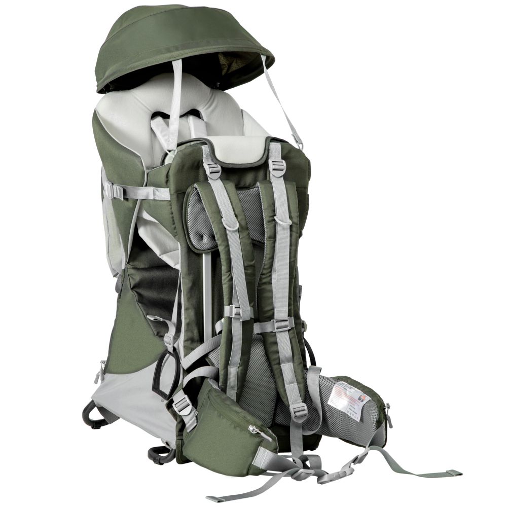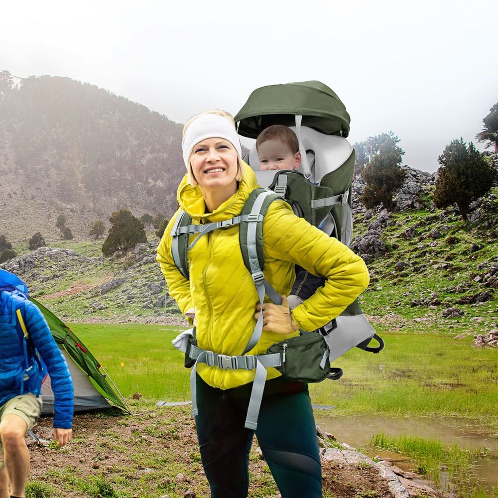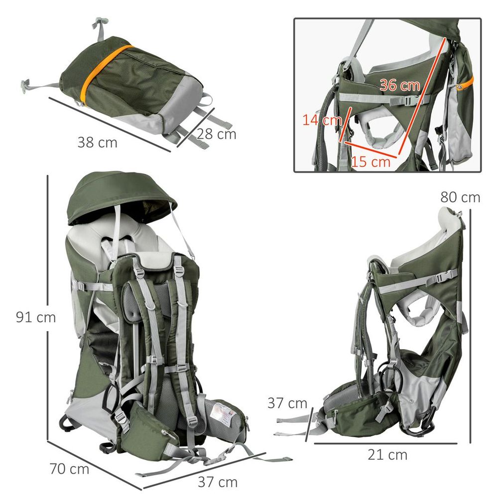 Comfortable: A soft seat to sit on, children will be cosy when inside. Also includes a detachable canopy � perfect for windy or rainy conditions.70-140cm Adjustable waist belt: A thick padded waist belt and shoulder strap, keeping the baby hiking backpack carrier secure to your back. The weight is spread evenly across your shoulders and waist.Safety & storage: Includes a five-point seatbelt and foot stirrups, keeping children secure. Also has a pocket on the side, which can hold mobile phones, nappies, flashlights and other small items.Foldable: A compact baby backpack carrier, which saves space when storing. Made with lightweight aluminium that weighs 3.2kg, making it easy to move and carry. Support feet at the bottom keeps it upright when placed down.Dimensions: Including canopy: 91H x 37W x 70Dcm. Foldable: 80H x 37L x 21Wcm. Suitable for 6-36 months. Maximum load 18kg. Certification: EN13209-1, EN71-3. Assembly required.