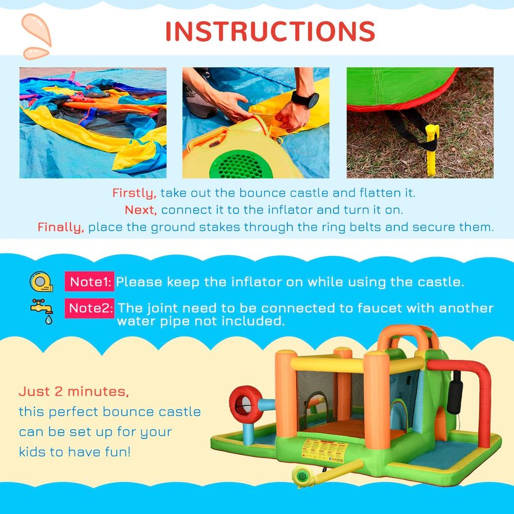 Multiple activities: Includes a slide, water pool, trampoline, tunnel, ball-target, boxing post and water gun. There's lots to do on this inflatable pool, keeping children filled with excitement and laughter as they have fun.Inflates quickly: With a 750W electric air blower included, this bouncy castle can be set up within two minutes. It can deflate quickly too, so it can be folded and stored in the included carry bag.Secure: The ground stakes keep this bouncy castle safely to the ground, whilst the high-density oxford fabric is weather-resistant � suitable for outdoors. It's big enough for four children at once. There are two patches of each colour to easily repair any damages.Dimensions: 210H x 478L x 440Wcm. Slide area: 280L x 58Wcm. Recommended age: 3-8 years.Maximum load 120kg. Suitable for up to four children (maximum weight of one child must be 30kg). Assembly required.